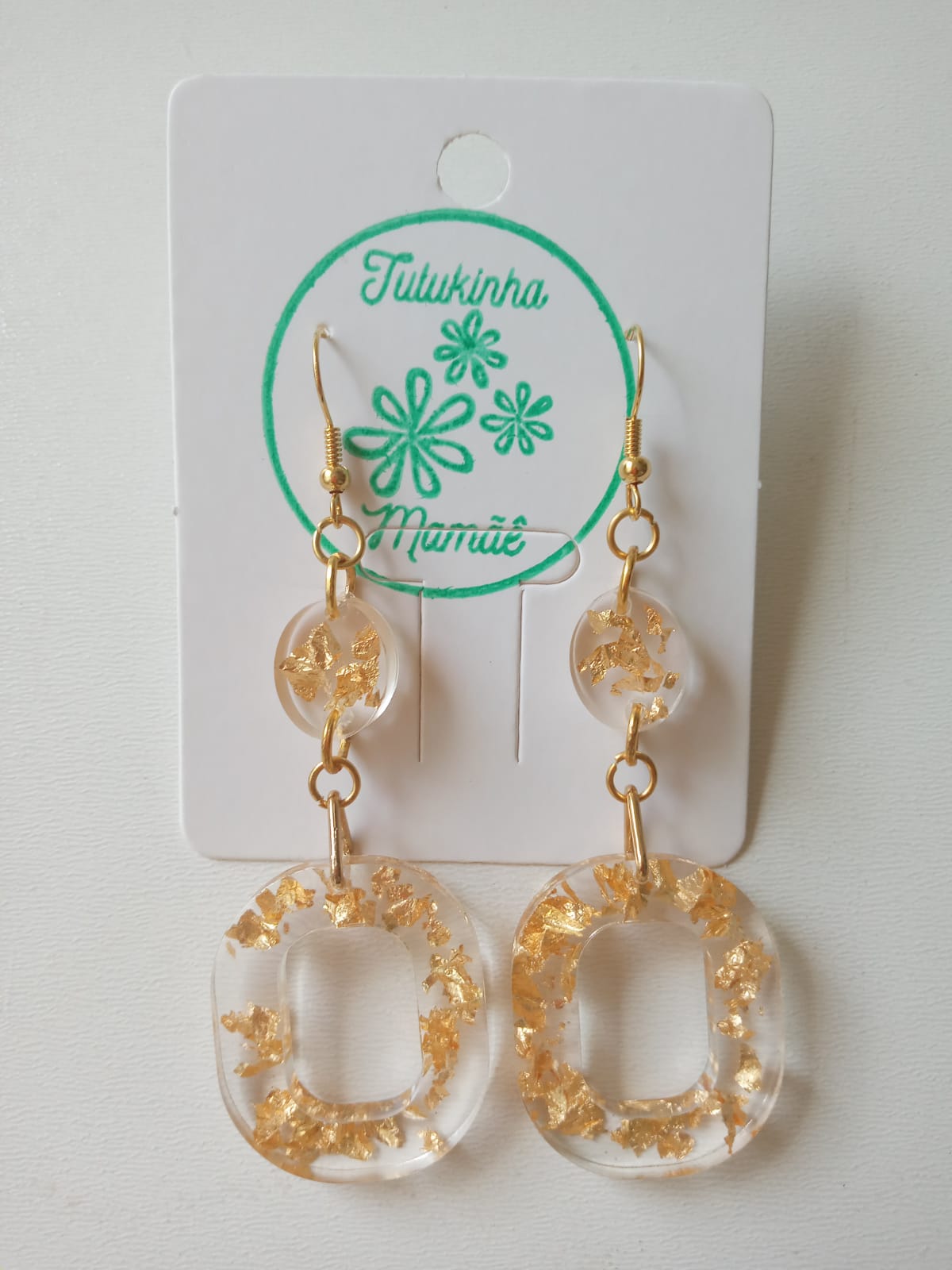Brinco grande transparente, pendente, tipo anzol, com aplique de folhas de ouro e aproximadamente 8,5cm de altura. Atenção para o prazo de entrega. Produto artesanal, a produção é bem parecida, mas não idêntica. Devido a configuração de cada monitor, poderá haver uma leve alteração na cor. Embalagem com 1 par. Tudo que ela toca vira ouro! Cabelo Afro. Cabelo Cacheado. Cabelo liso.