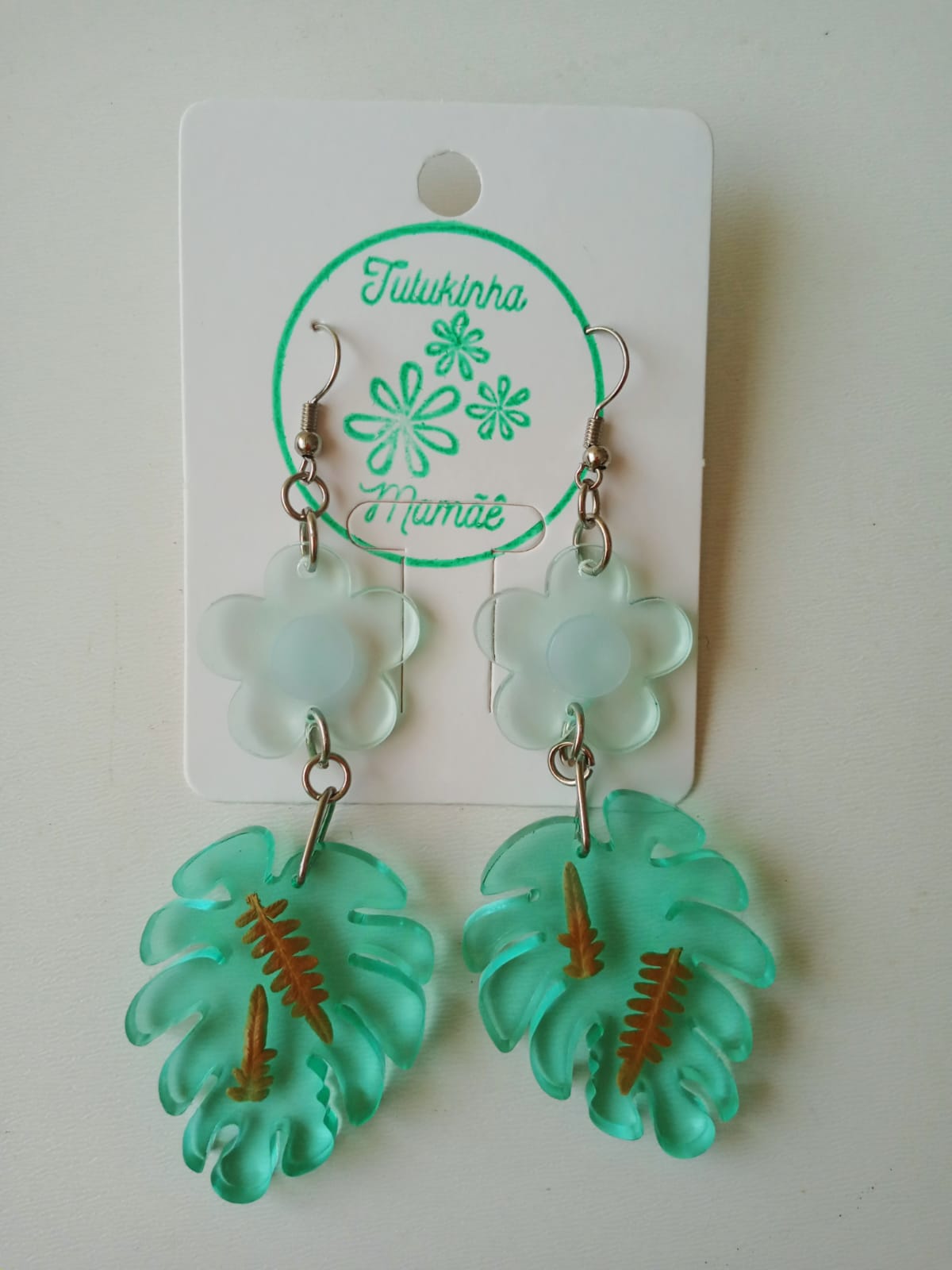 Brinco grande, pendente, tipo anzol, com aproximadamente 10cm de altura. Translúcido, com folha natural + acessório flor. Devido a configuração de cada monitor, poderá haver uma leve alteração na cor.