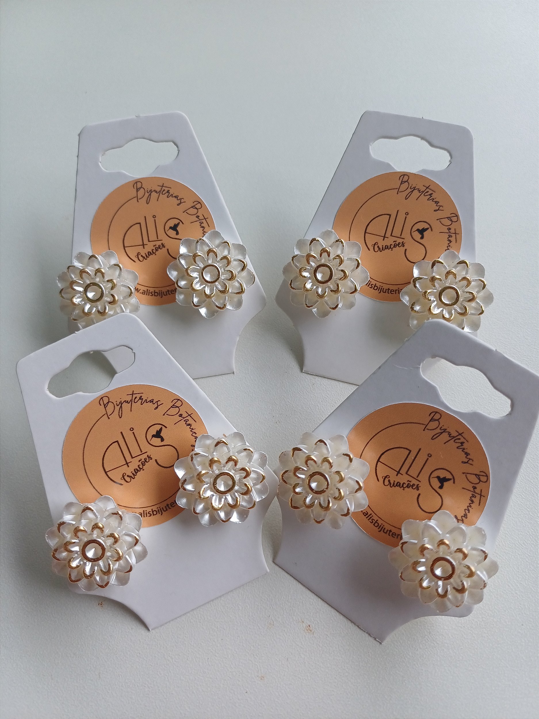 Brinco perolado em formato de flor Dália, com detalhes dourados, atarrachado, com tamanho aproximado de 2cm. Pérola. Dia das Mães. Dia Internacional da Mulher.