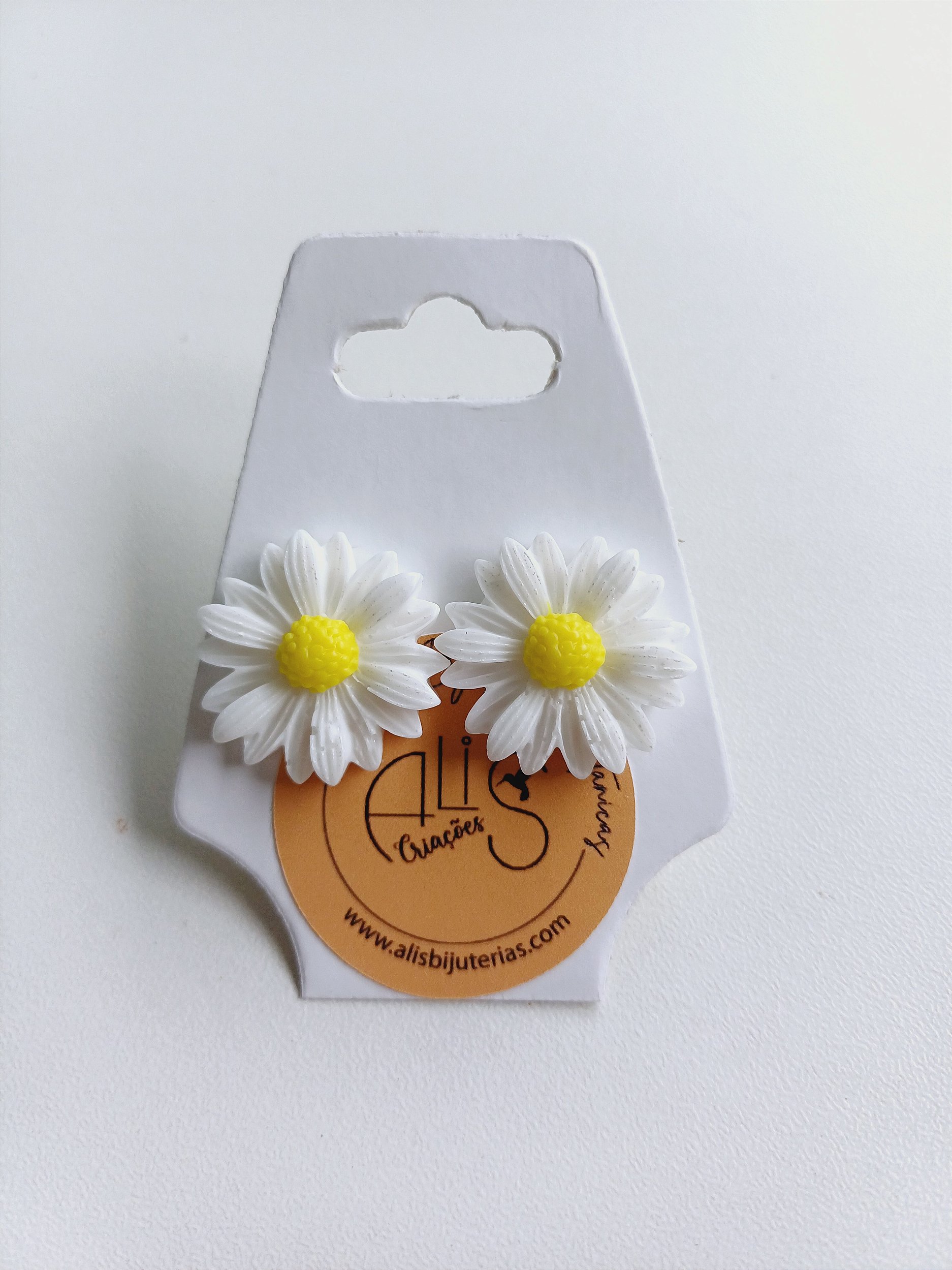 Brinco em formato de flor margarida, atarrachado, com tamanho aproximado de 2 cm. Dia das Mães. Dia Internacional da Mulher.