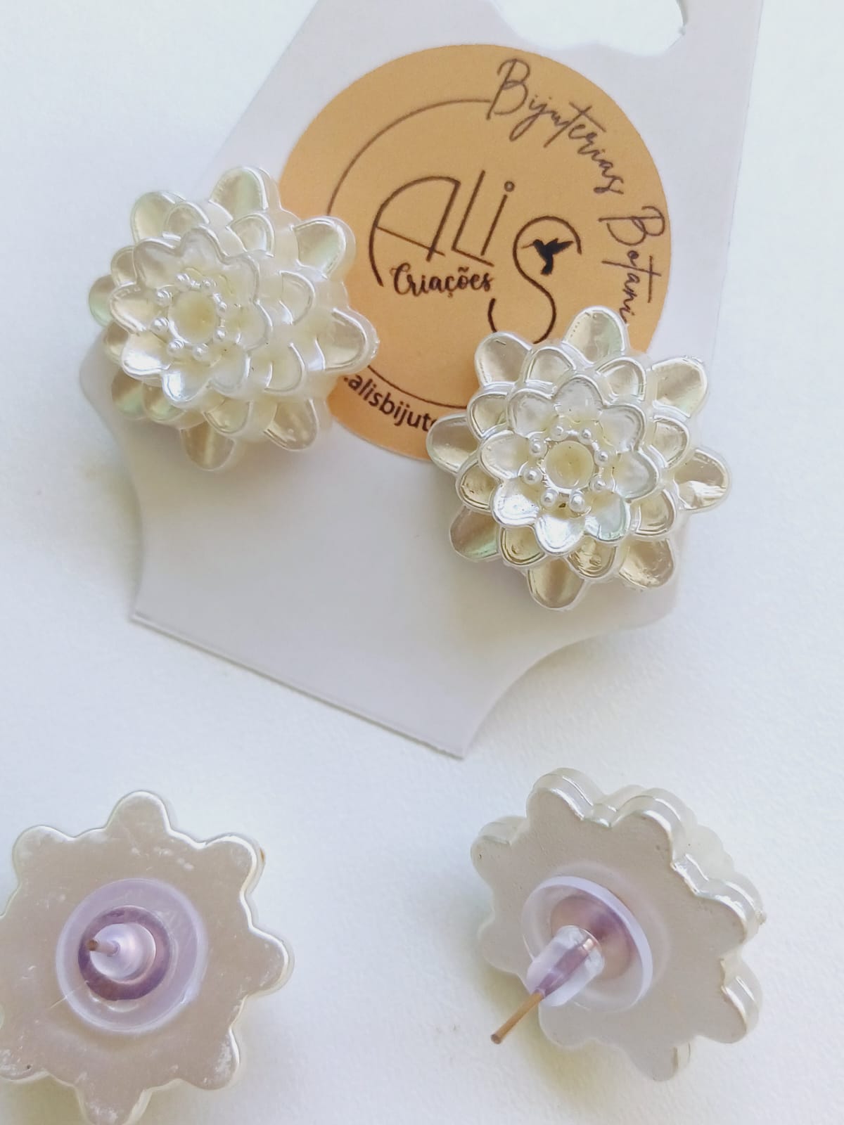 Brinco perolado em formato de flor Dália, atarrachado, com tamanho aproximado de 2cm. Pérola. Dia das Mães. Dia Internacional da Mulher.