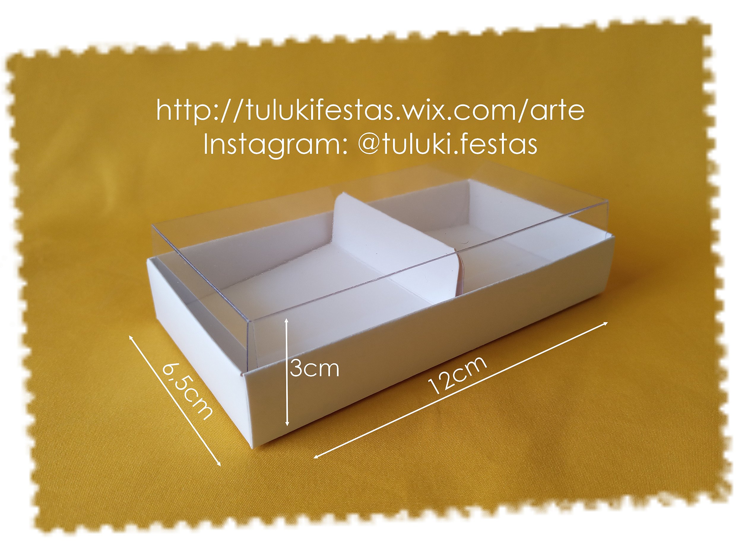 Em papel cartão branco, divisórias e tampa de acetato transparente. Medindo 12cm x 6,5cm x 3cm de altura. Cabem 2 doces.
