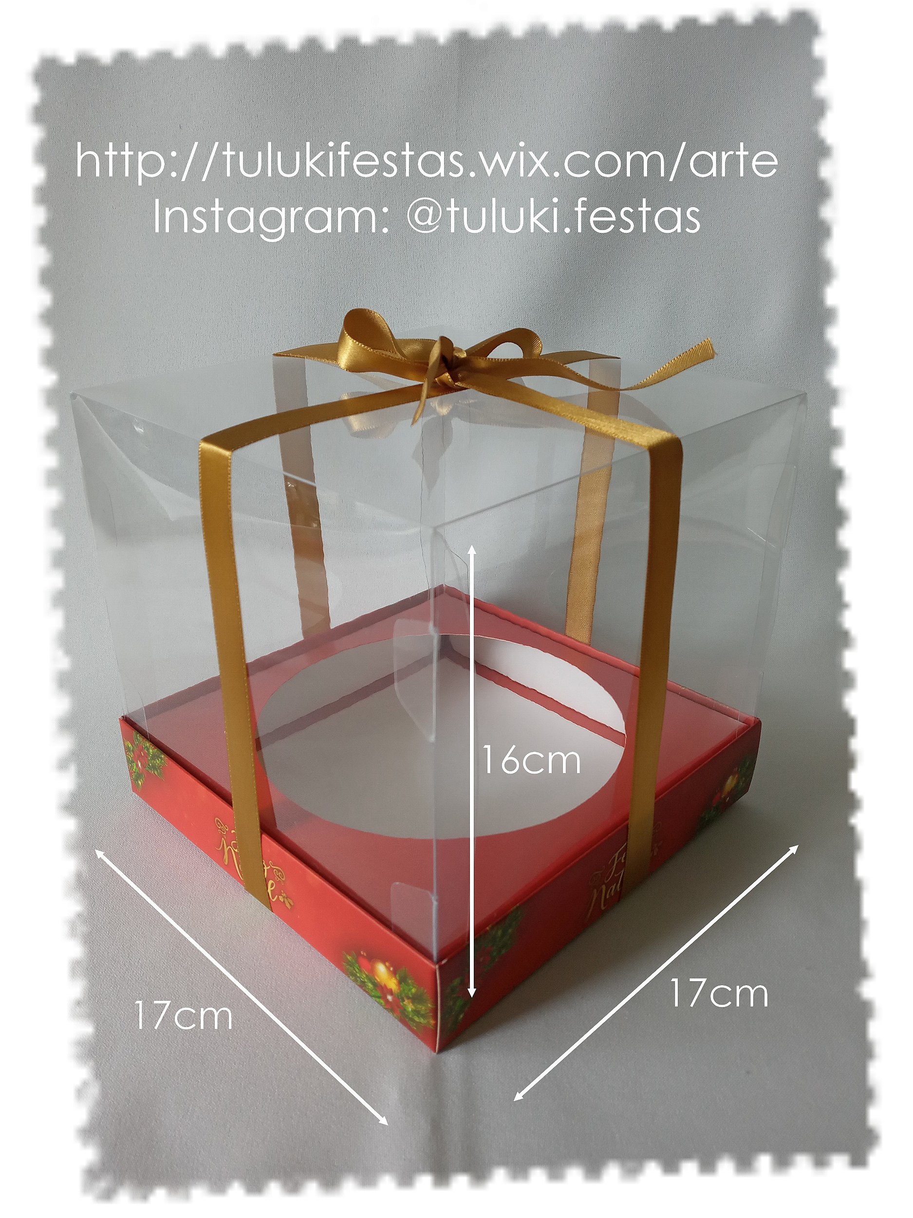 Caixa com base em papel cartão com estampa natalina e tampa em acetato 100% transparente, medindo 17cm x 17cm x 16cm. Natal Esplêndido! Jesus nasceu! Panetones de até 500g. Não acompanha a fita.
