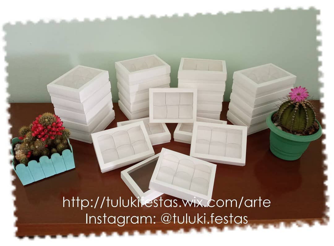 Em papel cartão liso. Medindo 12,5 cm x 9cm x 3cm de altura. Ideal também para 6 Docinhos Gourmet ou Trufas.