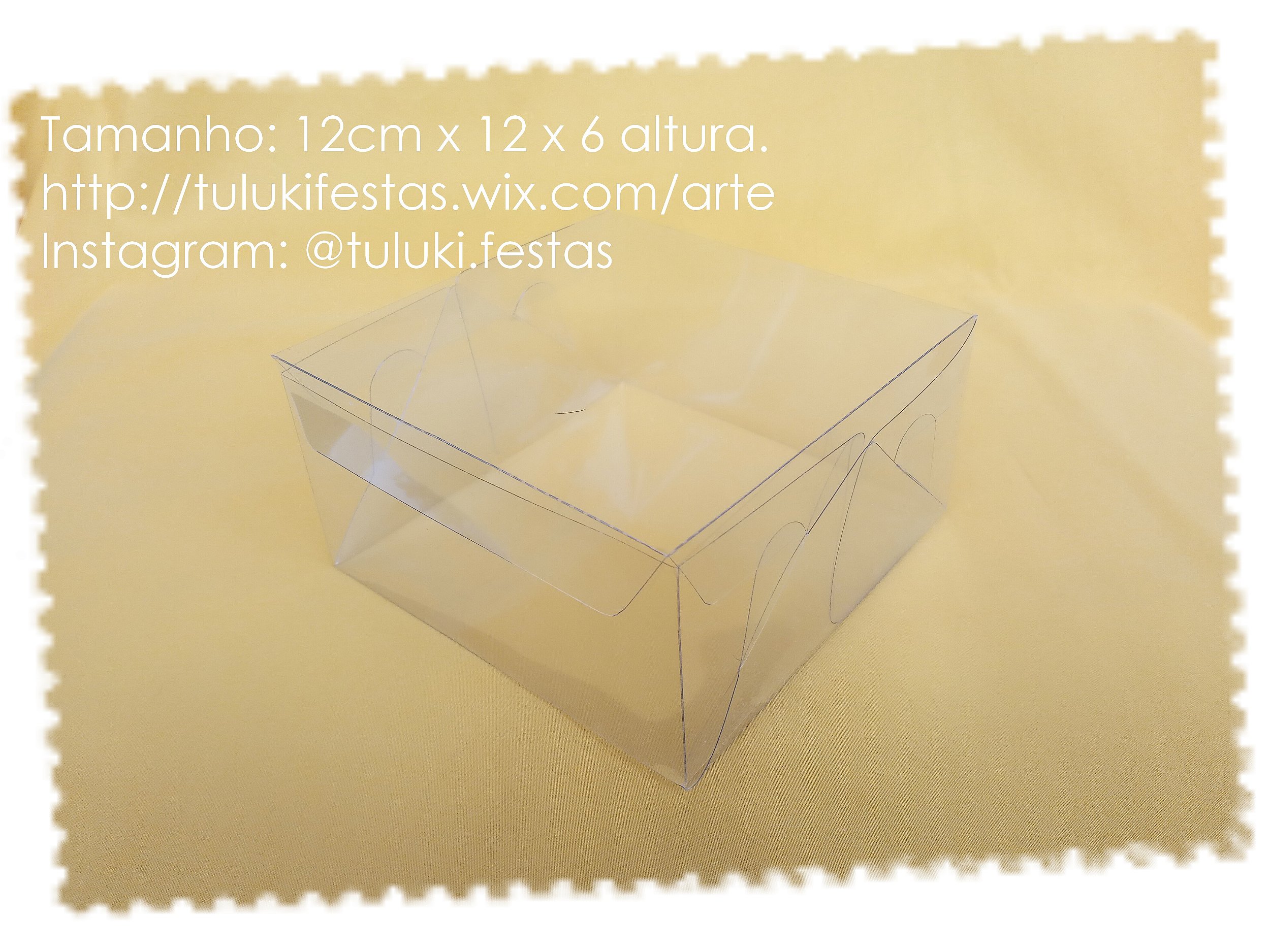 Em acetato, 100% transparente, medindo 12cm x 12cm x 6cm altura.