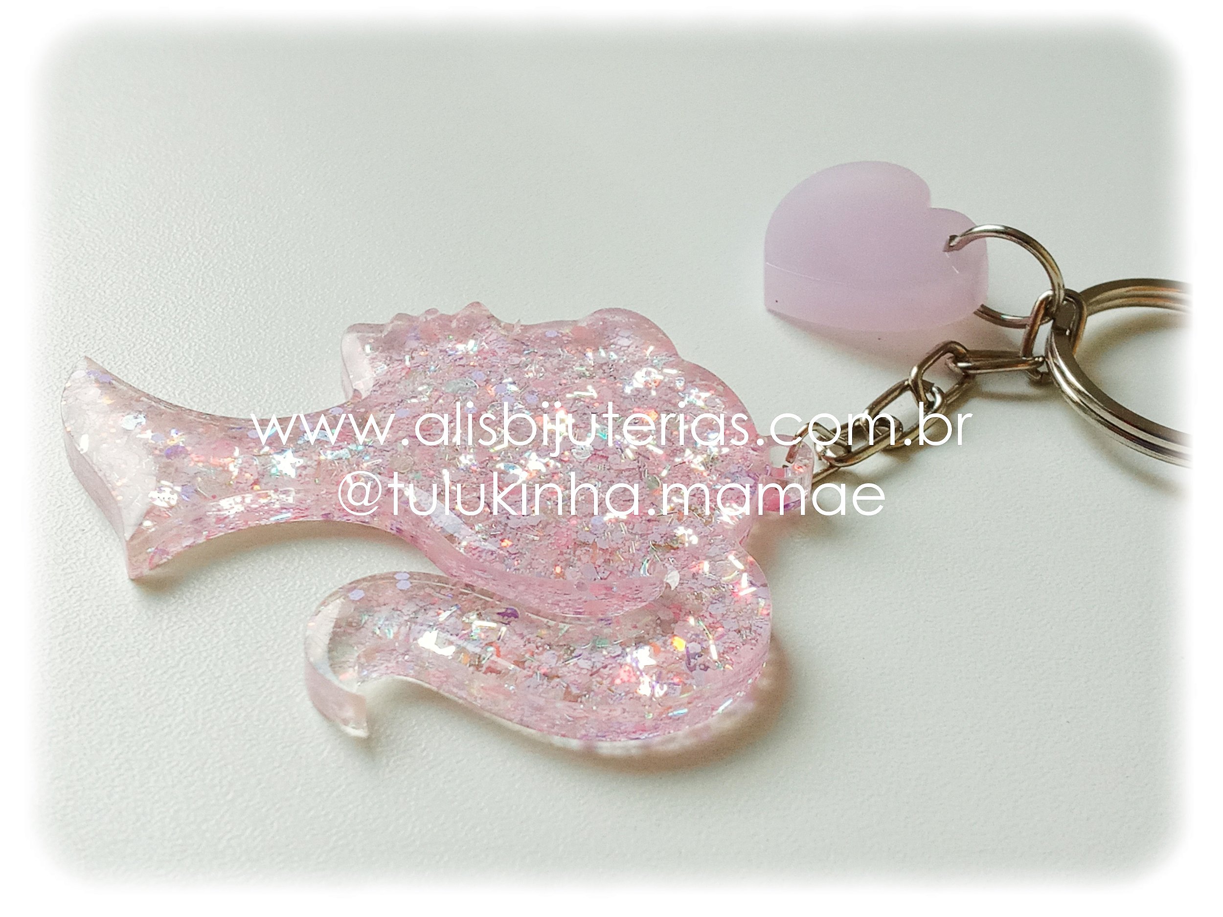 Chaveiro em resina com aplicação de glitter, medindo aproximadamente 6cm altura x 5 cm largura (sem a ferragem). Devido a configuração de cada monitor, poderá haver uma leve alteração na cor. Para encomenda, combine a cor pelo (71) 99103-6601. Embalagem com 1 unidade.