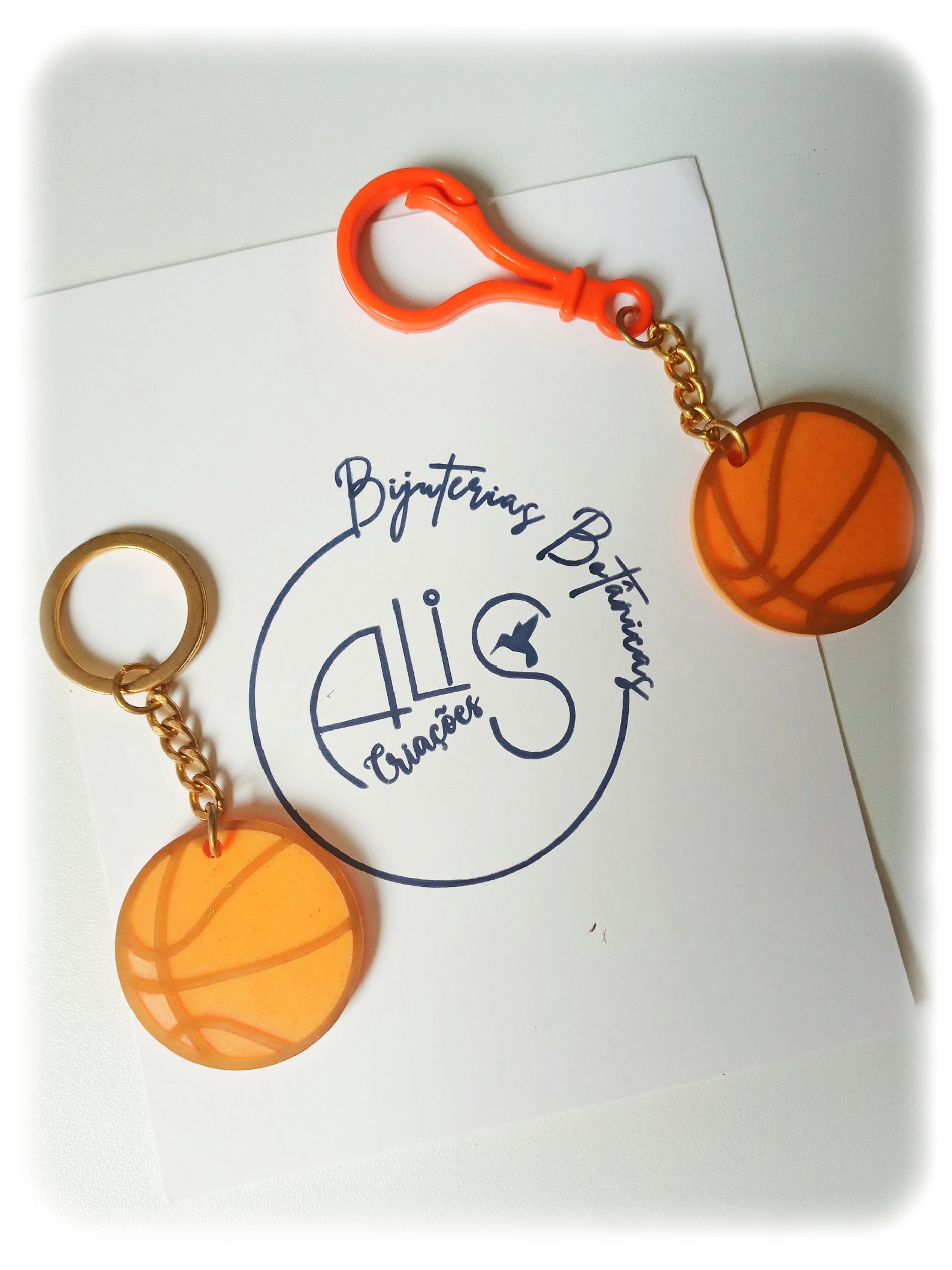 Chaveiro em resina, formato bola de basquete. Tamanho aproximado de 11cm x 3,5cm largura. Devido a configuração de cada monitor, poderá haver uma leve alteração na cor. Embalagem com 1 unidade.