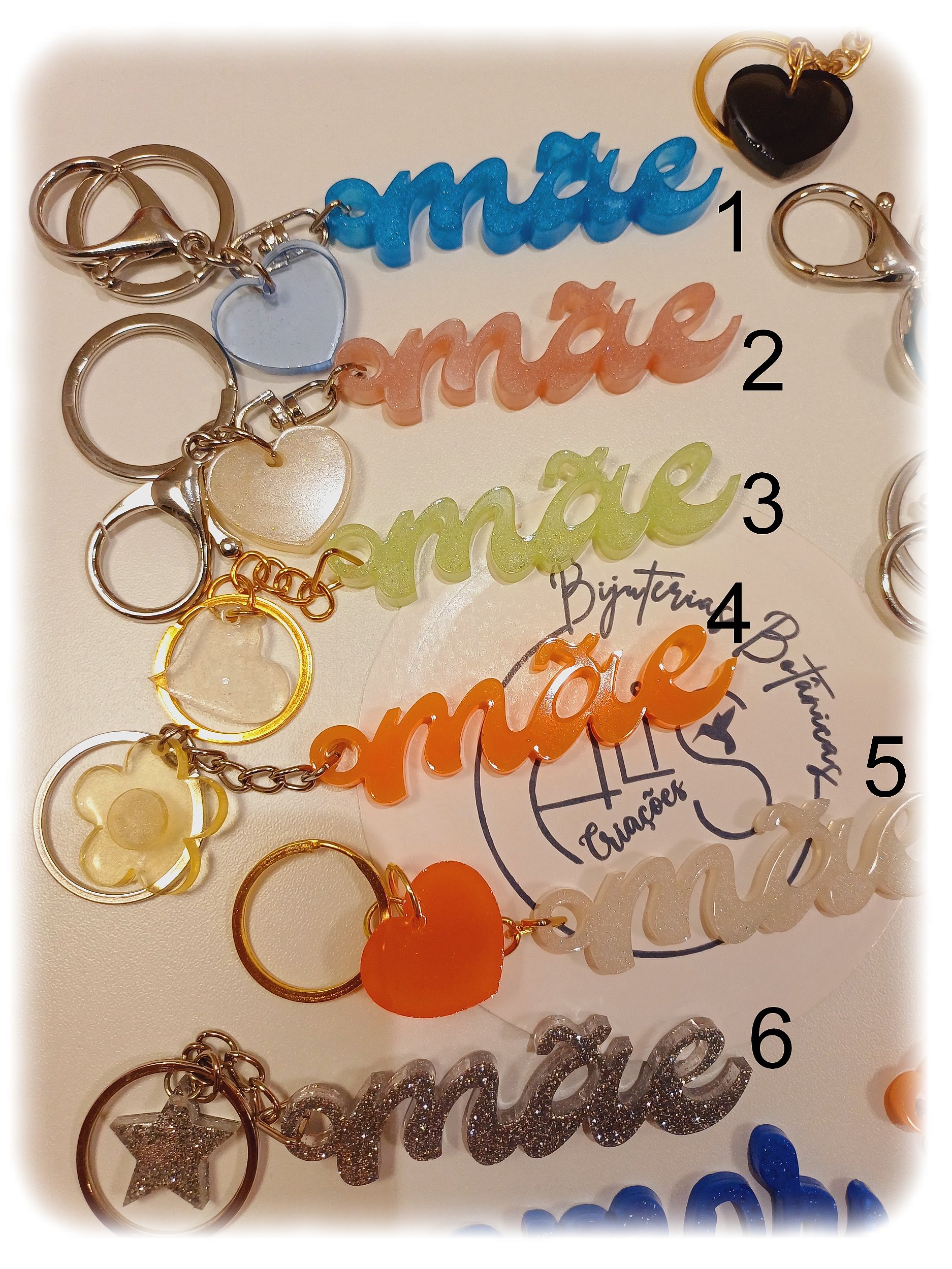 Chaveiro em resina no formato da palavra mãe, com pingente. Tamanho aproximado de 12 cm. Devido a configuração de cada monitor, poderá haver uma leve alteração na cor. Embalagem com 1 unidade. Dia das Mães. Dia Internacional da Mulher. Dia dos Avós. Amor Incondicional.