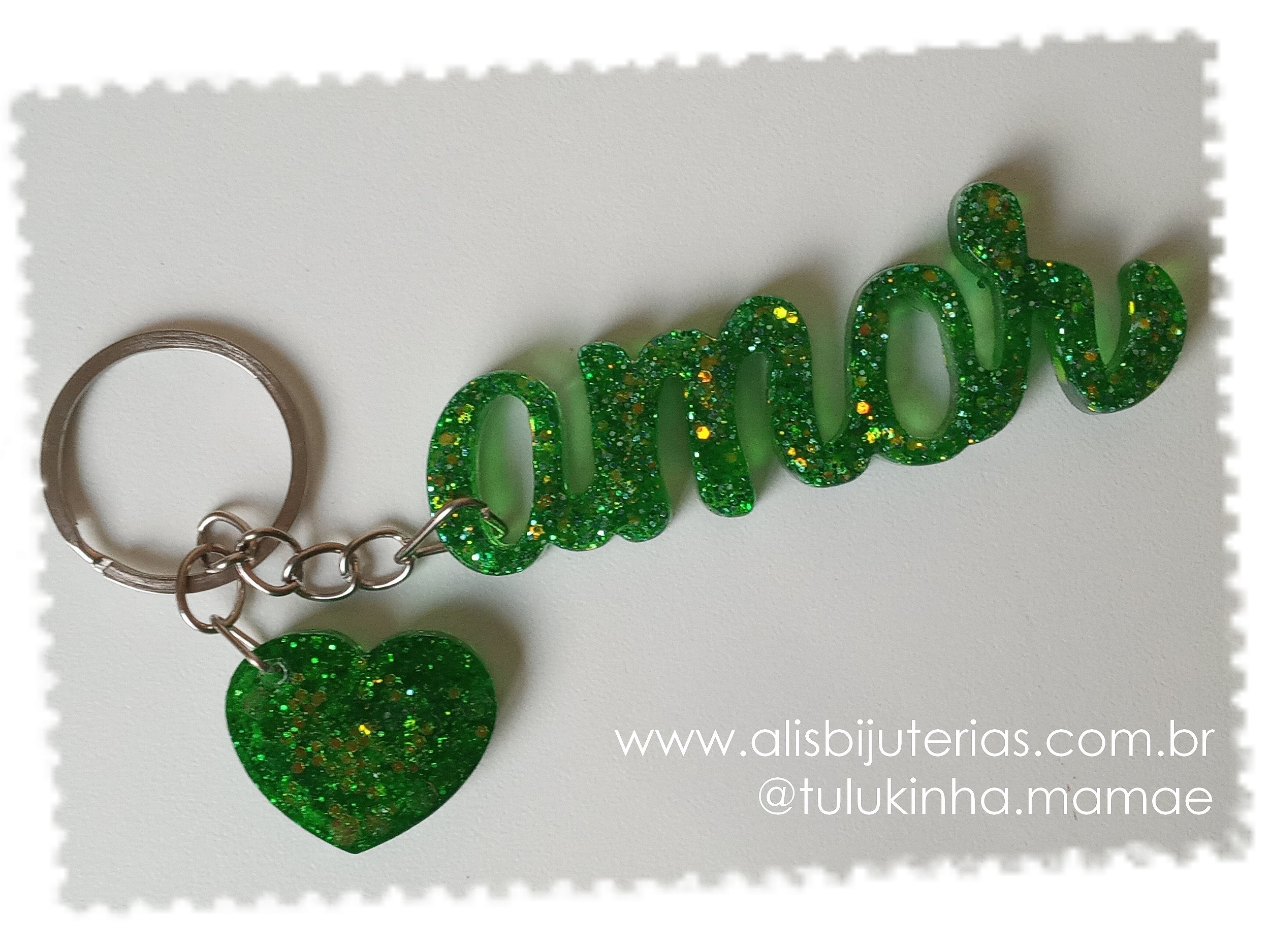 Chaveiro em resina, com glitter e pingente coração. Tamanho aproximado de 11,5cm x 2cm largura. Devido a configuração de cada monitor, poderá haver uma leve alteração na cor. Embalagem com 1 unidade.