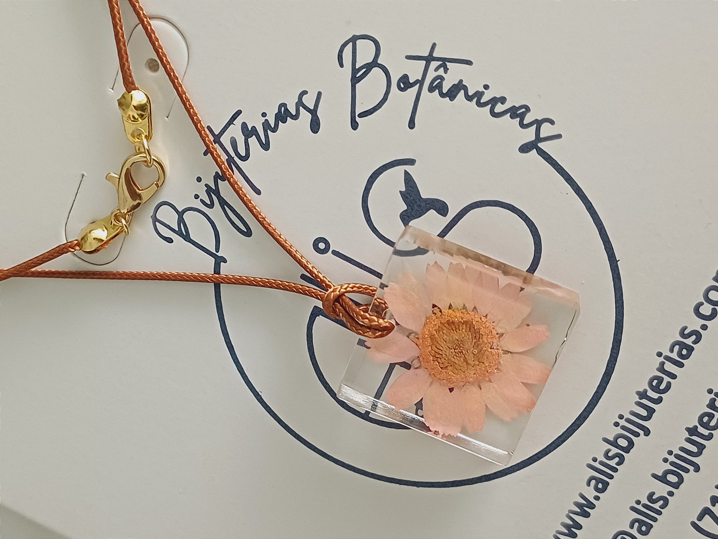 Cordão trançado, selado, na cor marron, com aproximadamente 50 cm de extensão. Ferragem dourada. Pingente em resina, com transparência e aplique natural da Flor Crisântemo, com aproximadamente 2,5 cm x 2,5 cm. Devido a configuração de cada monitor, poderá haver uma leve alteração na cor. Embalagem com 1 unidade. Fazemos também sob encomenda. Sempre Viva. Botânica. Biologia. Natureza. Joia Botânica. Joia Afetiva.