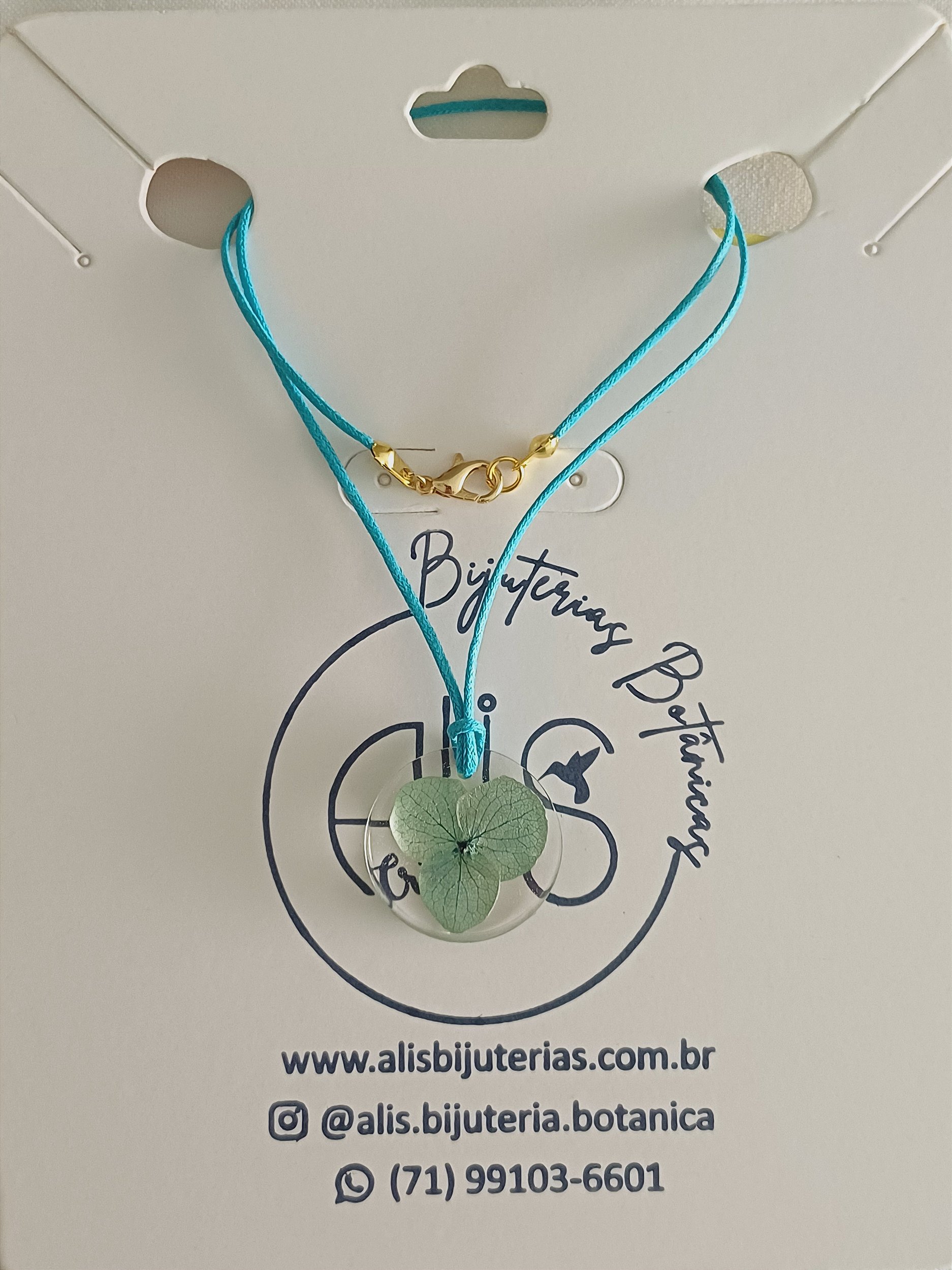 Cordão trançado, selado, na cor azul, com aproximadamente 50 cm de extensão. Pingente em resina, com transparência e aplique natural da Flor Hortênsia, com aproximadamente 2,5 cm x 2,5 cm. Devido a configuração de cada monitor, poderá haver uma leve alteração na cor. Embalagem com 1 unidade. Fazemos também sob encomenda. Sempre Viva. Botânica. Biologia. Natureza. Joia Botânica. Joia Afetiva.