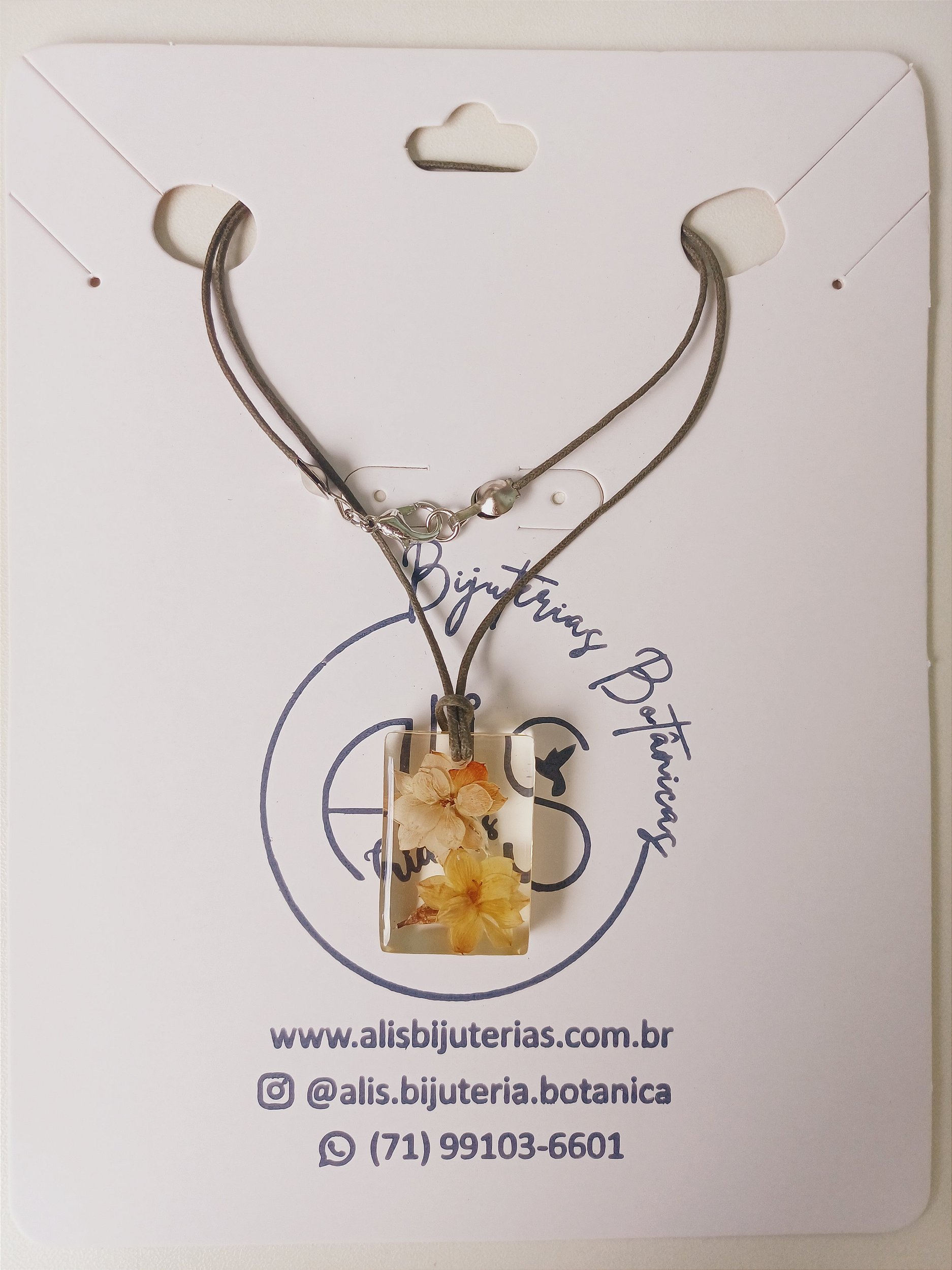 Cordão trançado, selado, na cor verde musgo, com aproximadamente 50 cm de extensão. Ferragem prata. Pingente em resina, com transparência e aplique natural da Flor Kalanchoê, com aproximadamente 3 cm x 2 cm. Devido a configuração de cada monitor, poderá haver uma leve alteração na cor. Embalagem com 1 unidade. Fazemos também sob encomenda. Sempre Viva. Botânica. Biologia. Natureza. Joia Botânica. Joia Afetiva.