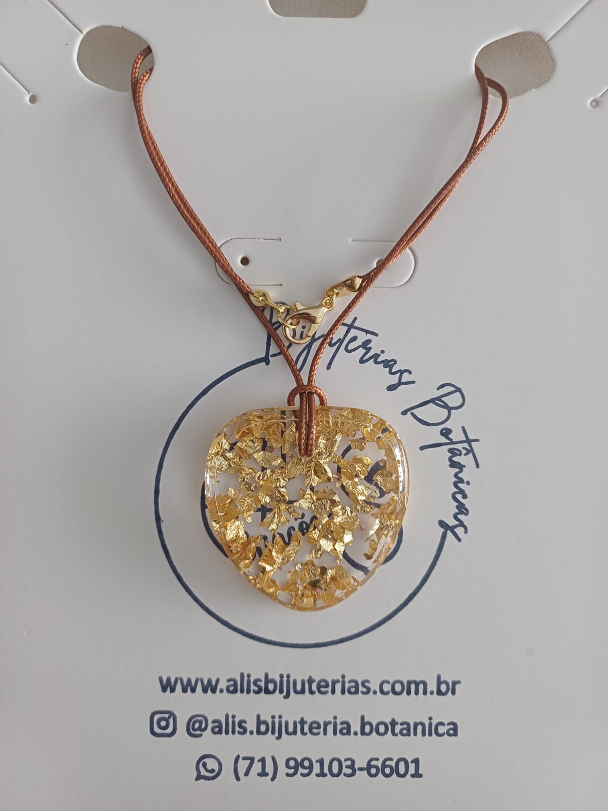 Cordão trançado, selado, na cor marron, com aproximadamente 50 cm de extensão. Pingente em resina, com transparência e apliques de laminados dourados, medindo aproximadamente 3,9 cm x 3,9 cm. Devido a configuração de cada monitor, poderá haver uma leve alteração na cor. Embalagem com 1 unidade. Fazemos também sob encomenda. Bijuteria. Salvador. Bahia. Estilo e Conforto