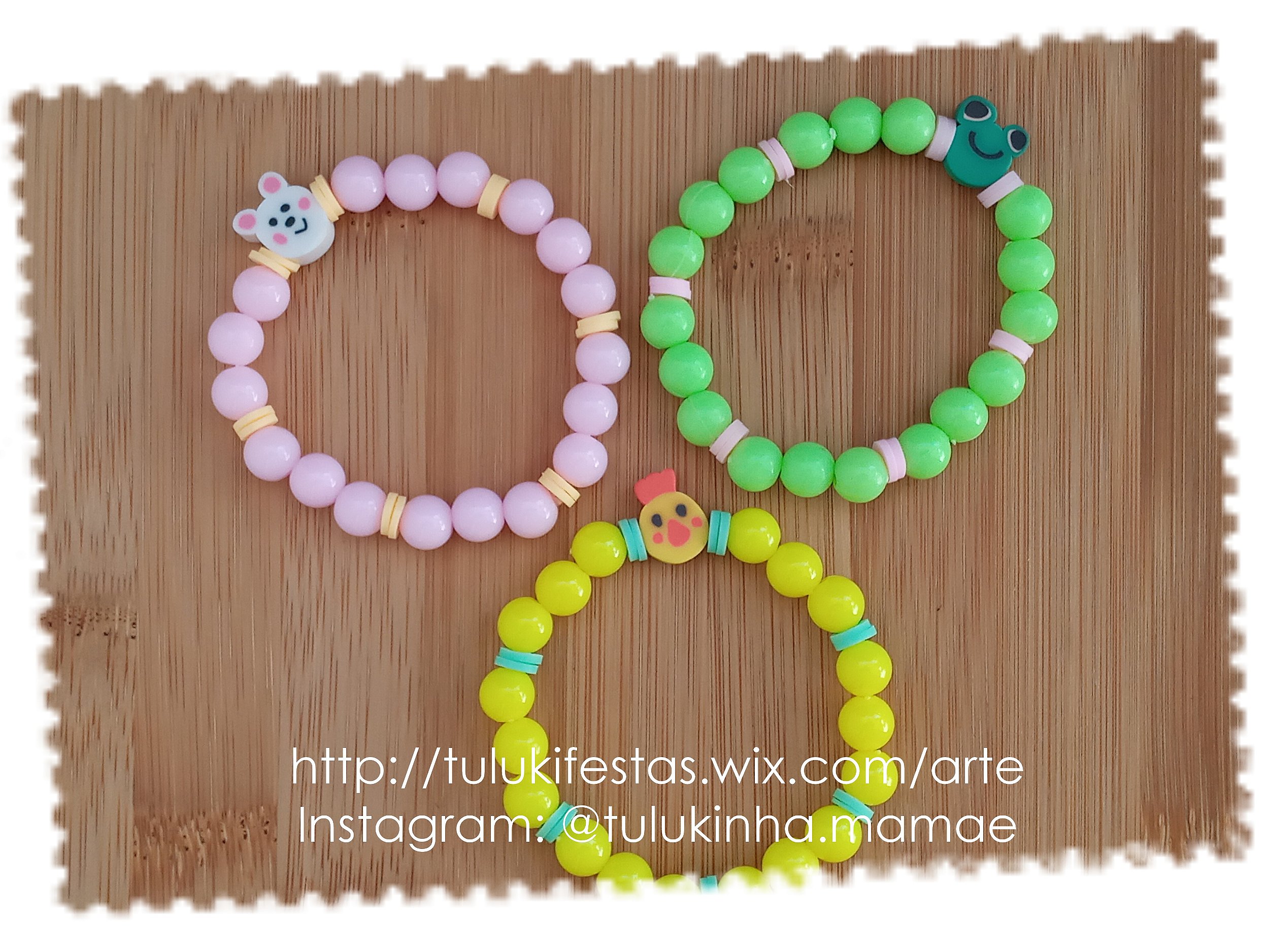 Conjunto triplo de pulseiras infantis elásticas (silicone) de miçangas, com entremeios de bichinhos. Devido a configuração de cada monitor, poderá haver uma leve alteração na cor. Embalagem com 3 unidade. Para princesas. Mãe de menina. Cheia de charme. Bijuteria Infantil.