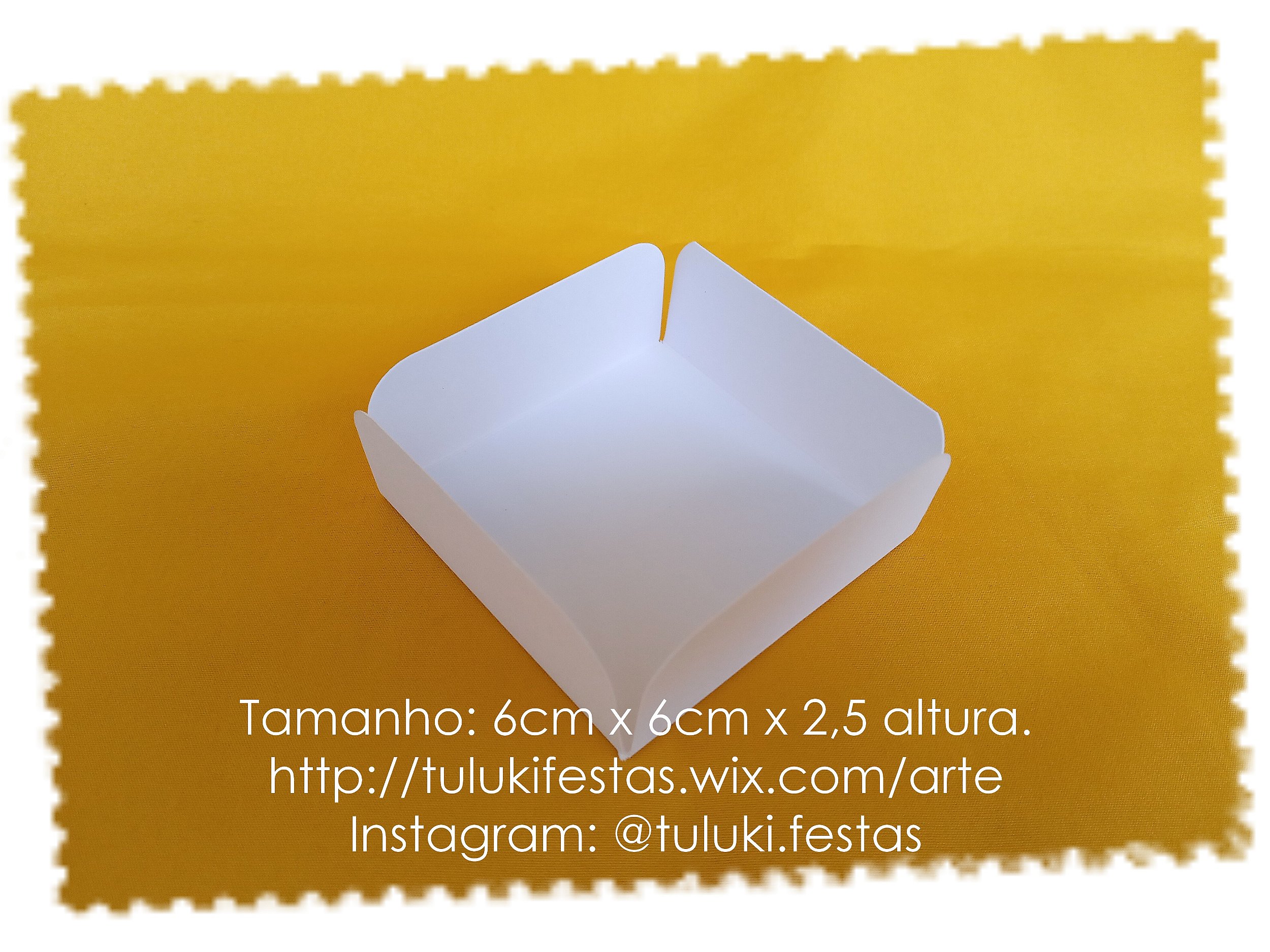 Em papel cartão branco, medindo 6cm x 6cm x 2,5cm altura. Embalagem com 50 unidades.