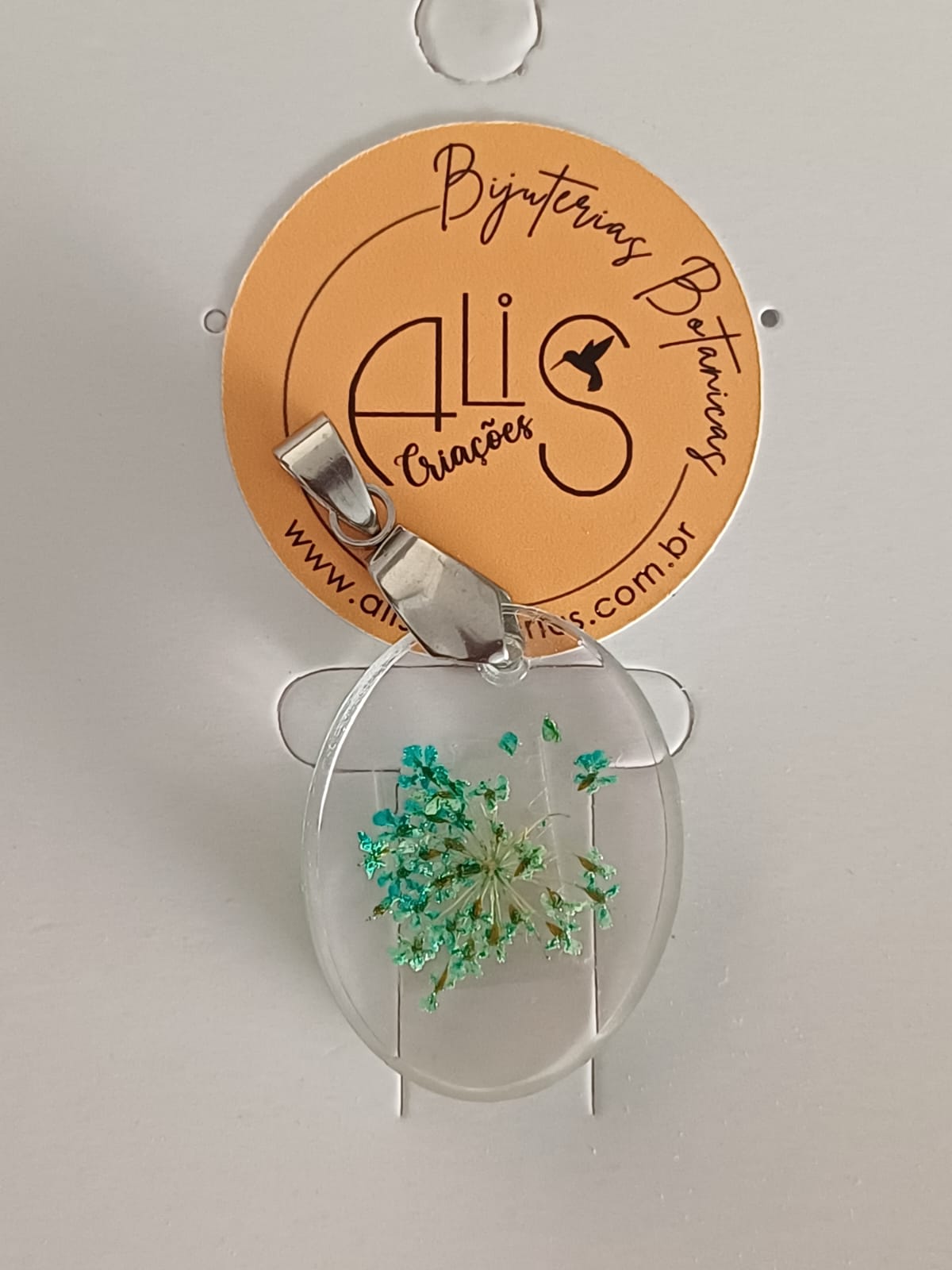 Pingente em resina, com aplique de flor natural, medindo aproximadamente 2,5cm altura x 2cm largura, com ferragem prata em aço inoxidável. Devido a configuração de cada monitor, poderá haver uma leve alteração na cor. Embalagem com 1 unidade.