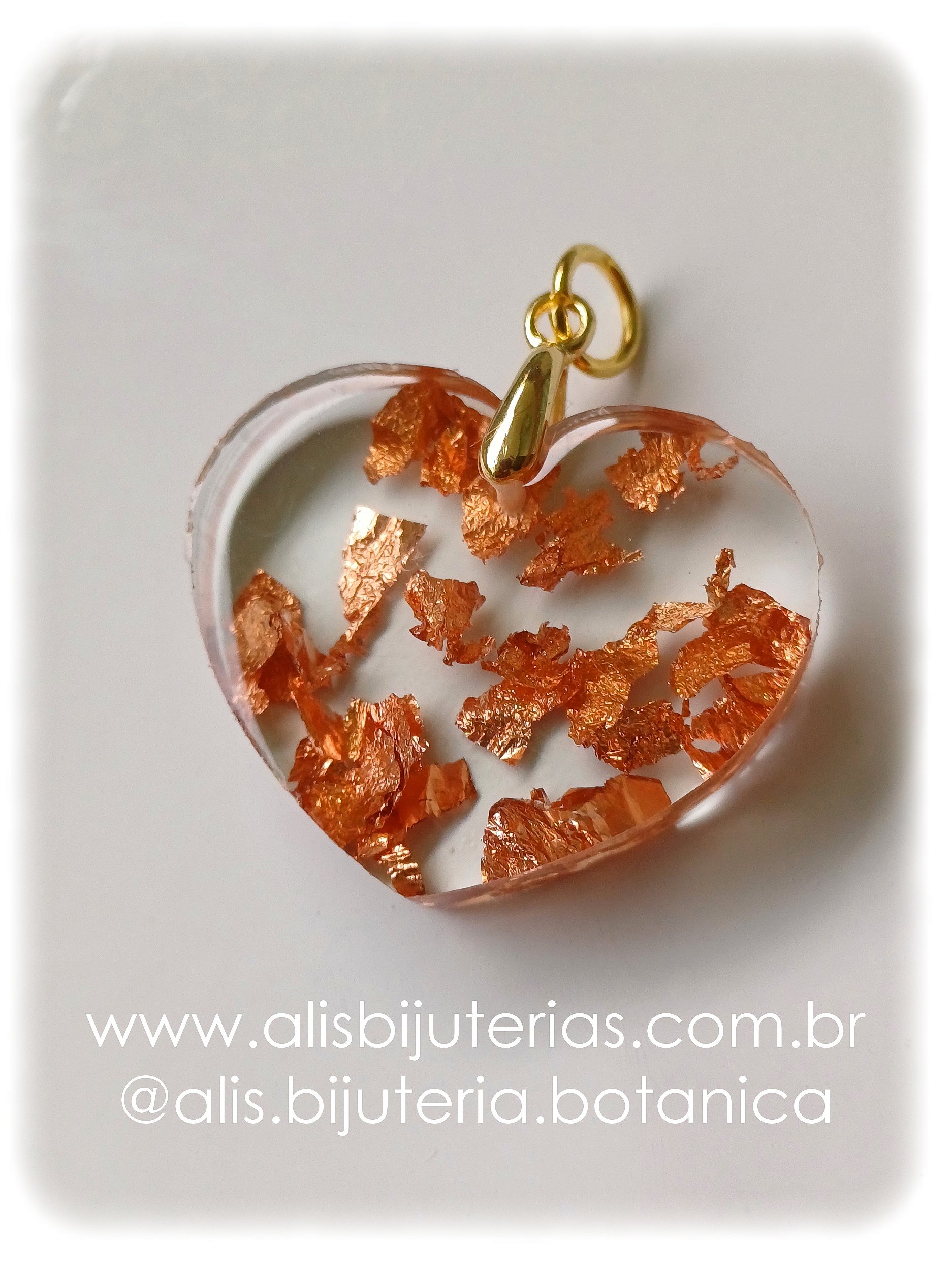Acessório com ferragem banhada dourada, medindo aproximadamente 2,5cm x 2cm (sem a ferragem) e apliques na cor cobre que trazem um efeito especial.