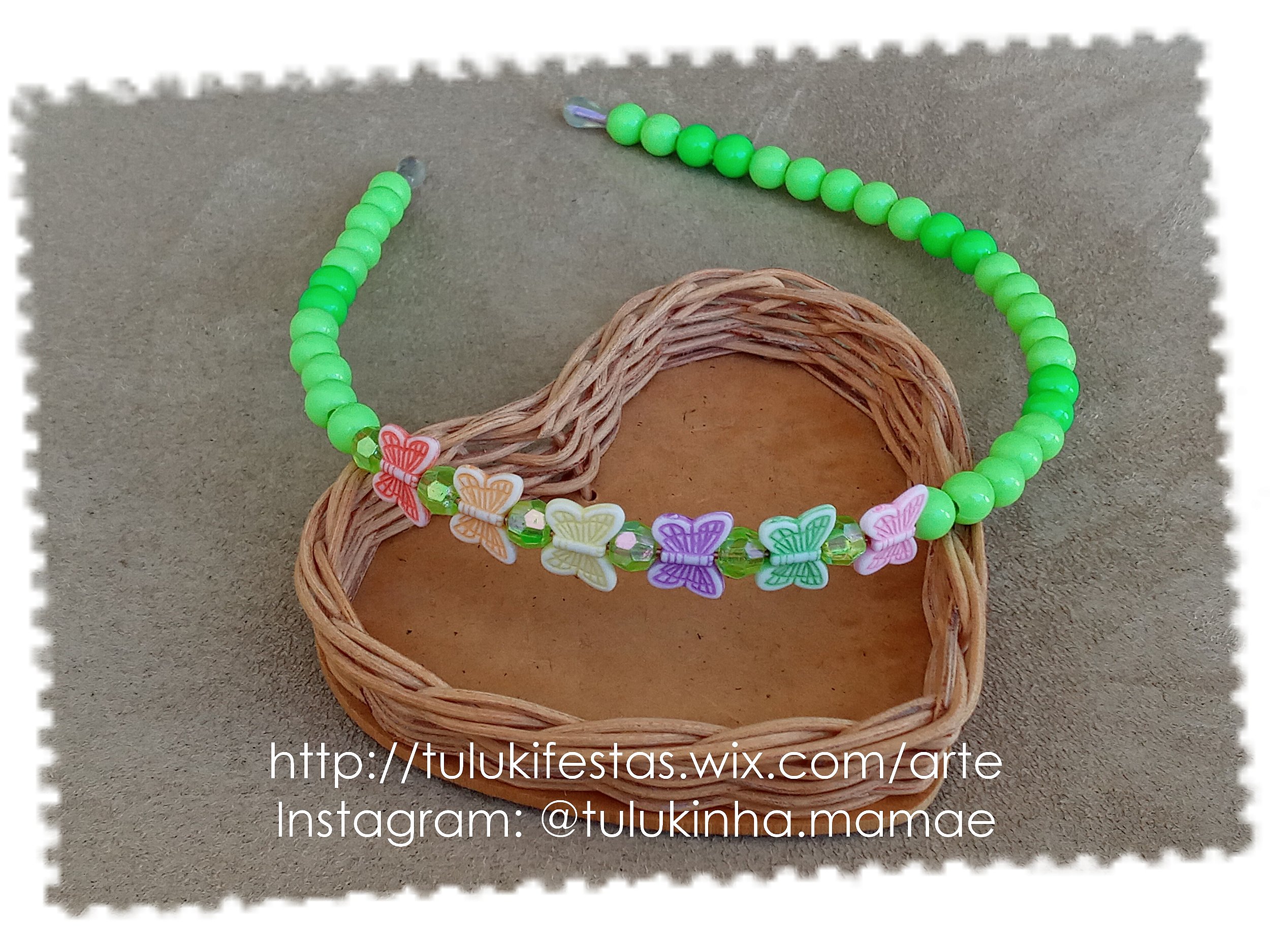 Tiara de miçangas, com entremeios de borboletas. Embalagem com 1 unidade. Devido a configuração de cada monitor, poderá haver uma leve alteração na cor. Piscina.