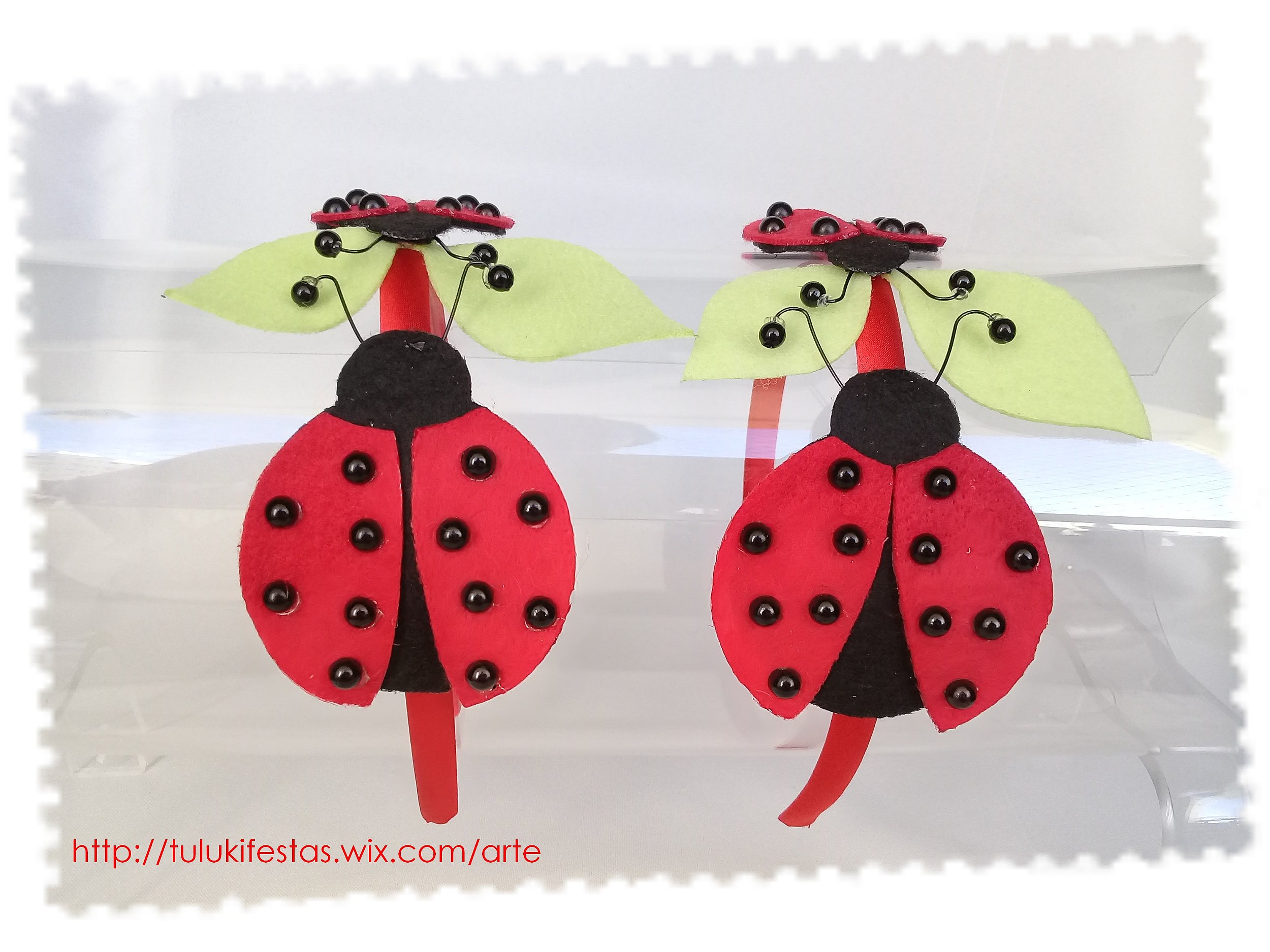 Tiara com forro em cetim e aplique de 2 joaninhas e 2 folhas em feltro e miçangas. Passadeira. Diadema. Arco de Cabelo.